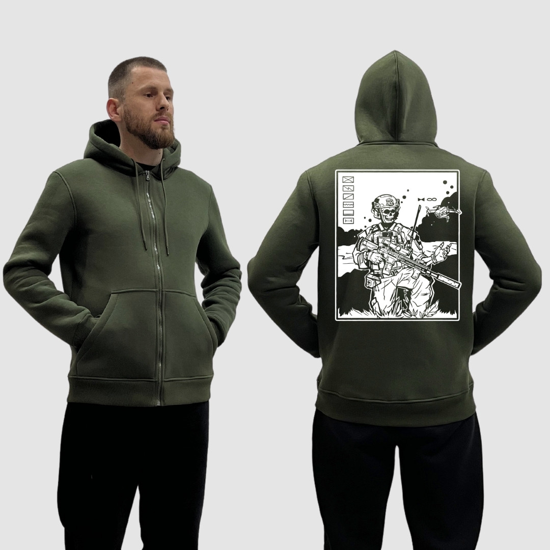 Чоловічий зіп-худі на флісі з принтом Військовий скелет рушниця дрон FPV розвідка, Хакі